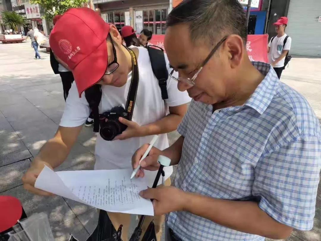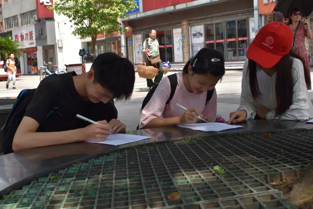 年轻一代是祖国未来的花朵,环保方面更需要他们接力,更需要他们做到“知行合一”。在人来人往的步行街上,队员们细心留意流动人群,分别邀请了一些小学生、初中生及高中生填写问卷。