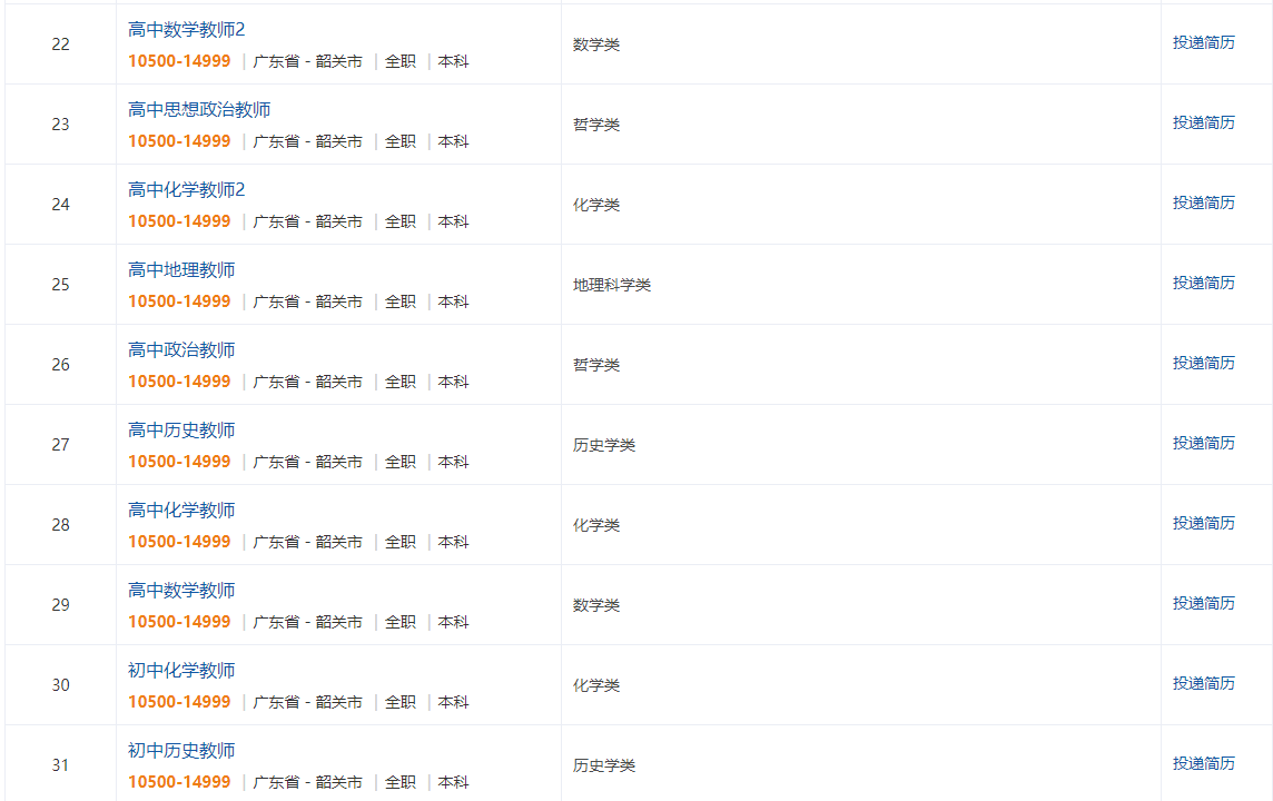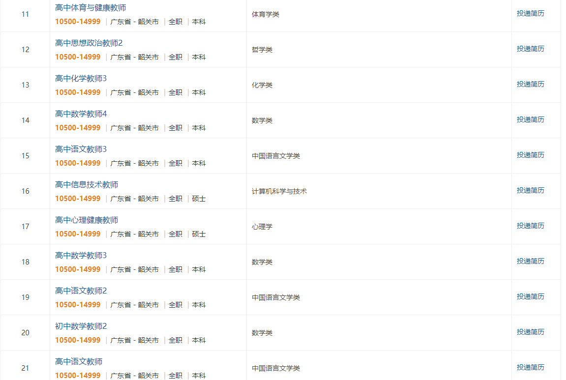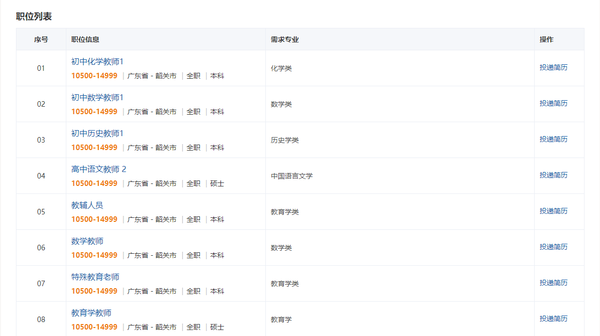 招聘岗位涵盖了初中、高中、特殊教育和高校学段,包括数学、化学、语文、历史、思想政治、地理、物理、体育、心理健康、信息技术、建筑学、教育学、特殊教育等学科(详见公告附件)。招聘单位为韶关市教育局直属的6所公办学校,分别为韶关市田家炳中学、韶州中学、韶关市张九龄纪念中学、韶关市第五中学、韶关开放大学、韶关市特殊教育学校。