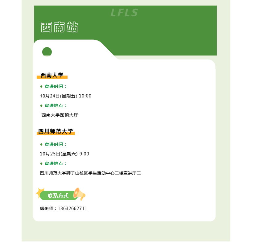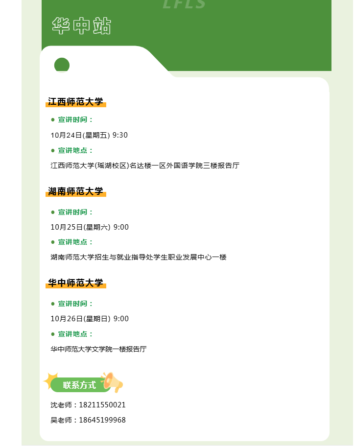 深圳市龙岗区外国语学校(集团)成立于2019年,是龙岗区第一个公办义务教育集团,2024年龙外集团被评为广东省首批基础教育优质集团。根据集团发展需要,集团拟面向2026届应届毕业生招聘50名正编教师,并将于10月24日—26日赴华中、华北、华南、西南等地开展校园宣讲会,具体宣讲时间及地点安排如下: