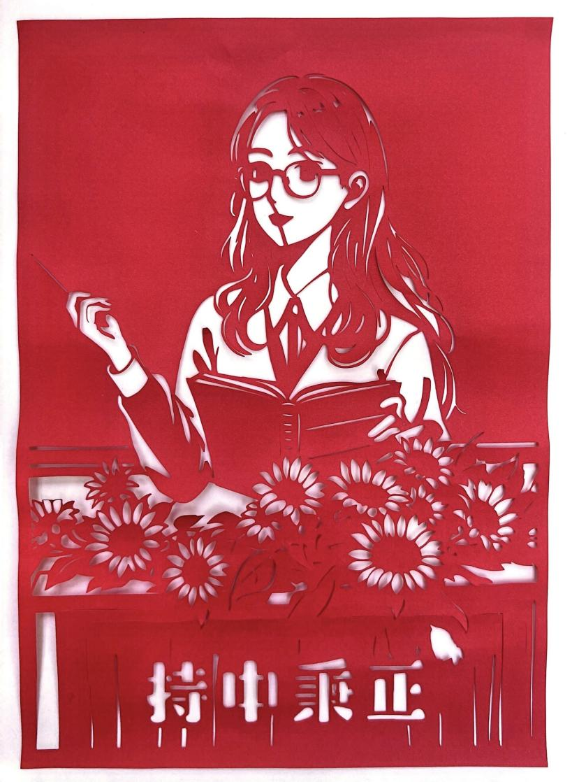 一剪一纸蕴师恩,方寸之间见匠心。这幅剪纸作品我以传统艺术形式定格伟大教师躬身执笔的身影。“持中秉正”四字如经纬纵横,是师者精神的巍然脊梁:以公正为规,以仁爱为矩,在岁月长河中为无数心灵裁出澄澈的天空。每一道剪刻的镂空都是知识的通道,每一次用心的压折都是品格的塑形。谨以此作致敬天下师者:您以灵魂之火点燃我们的心灯,用人格之光为我们铺就人生的中正之路。