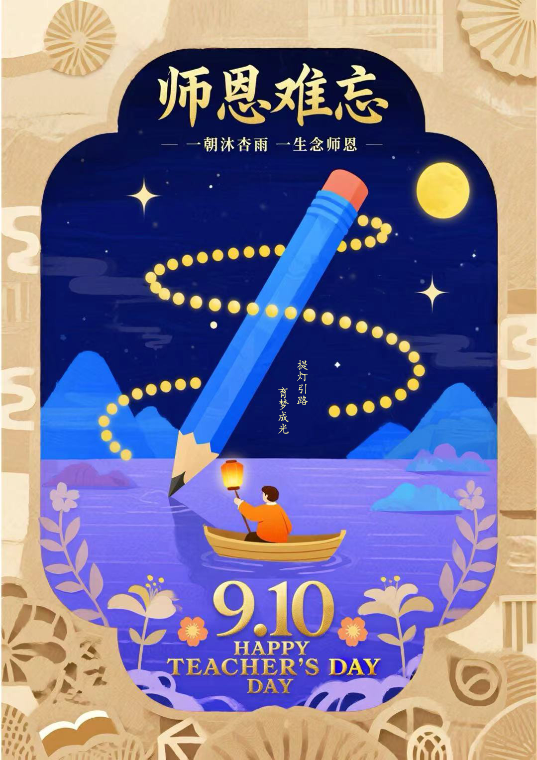 以夜晚山水为背景,营造静谧氛围。巨型蓝色铅笔与黄色光点结合,似在书写希望之路,寓意老师用知识为学生勾勒梦想轨迹。人物乘舟提灯,象征老师如灯,为学生照亮逐梦航程。整体色彩和谐,元素富有诗意,传递出老师对学生成长的指引。
