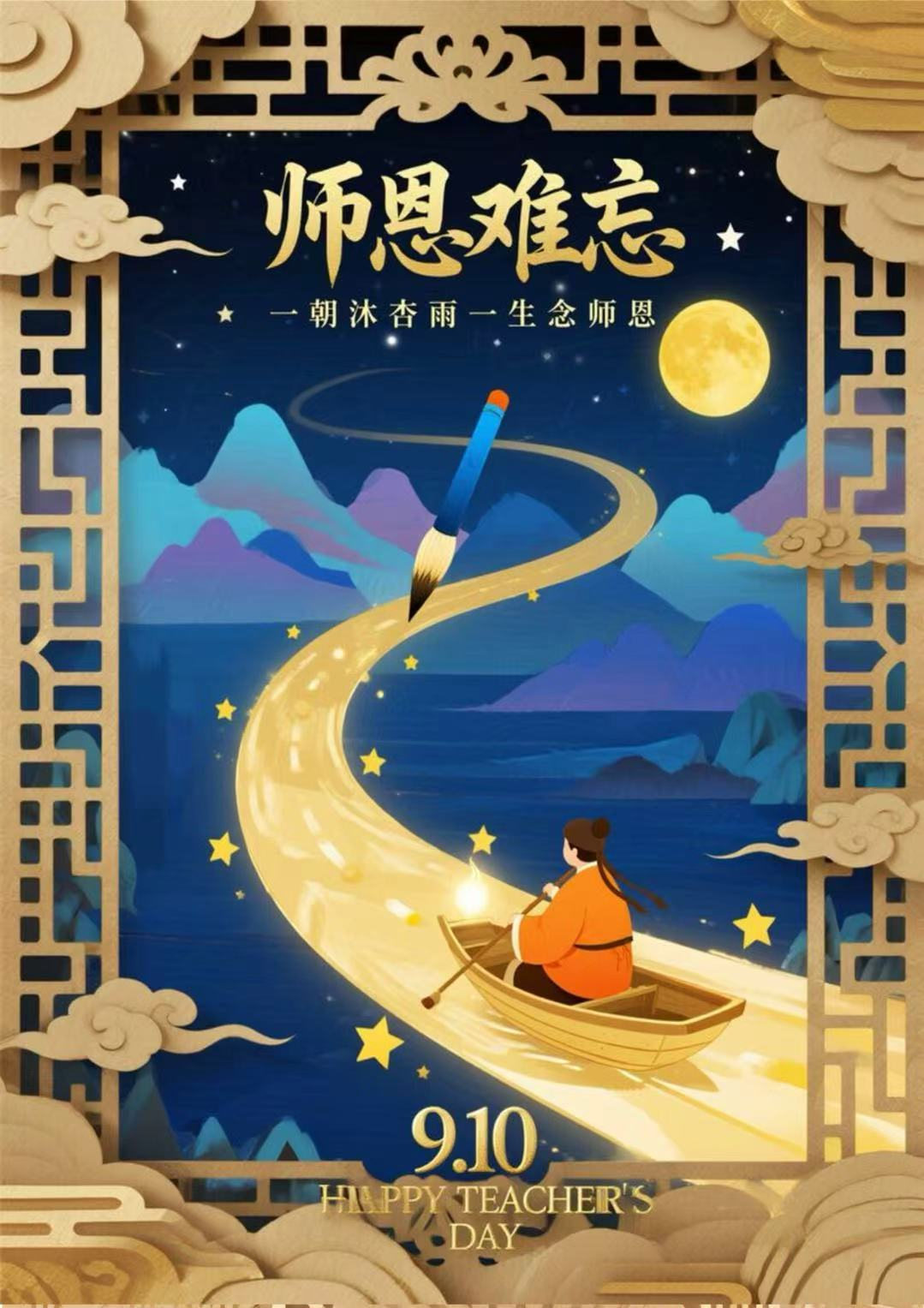 采用传统中式边框,融入祥云等元素,充满文化底蕴。毛笔造型与金色星光路相衬,展现老师以文化为墨,为学生铺就成才坦途。人物古装乘舟,更添古典意境,凸显师恩的深厚绵长。
