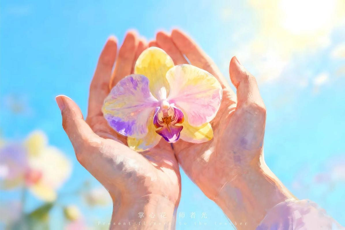 以一双温柔的手捧起一朵色彩雅致的兰花,是对“敬师赠花”传统意象的诗意化呈现。兰花向来有“君子之花”的美誉,象征着教师如兰般高洁的品格、默默芬芳的奉献精神;而双手捧持的姿态,既传递出学生对师恩的珍视与感恩,又暗含教师以双手托举希望、培育桃李的育人情怀。