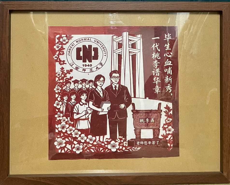 这幅剪纸风格纹理沙画以“毕生心血哺新秀,一代桃李谱华章”为核心意境,将传统剪纸的细腻线条与沙画的灵动质感相融合。画面中,“桃李鼎”的轮廓以剪纸纹路勾勒,象征教师如鼎般坚实的育人担当;“老师您辛苦了”的字样藏于沙粒纹理间,传递出质朴真切的感恩之情。沙的流动感呼应着教师春风化雨的教诲,剪纸的规整感寓意师德的严谨厚重。作品既展现了对教师辛勤付出的敬意,也体现了新时代研究生传承尊师美德、践行社会主义核心价值观的真挚心意,愿以这份创意之作,致敬每一位深耕讲台、铸魂育人的师者!